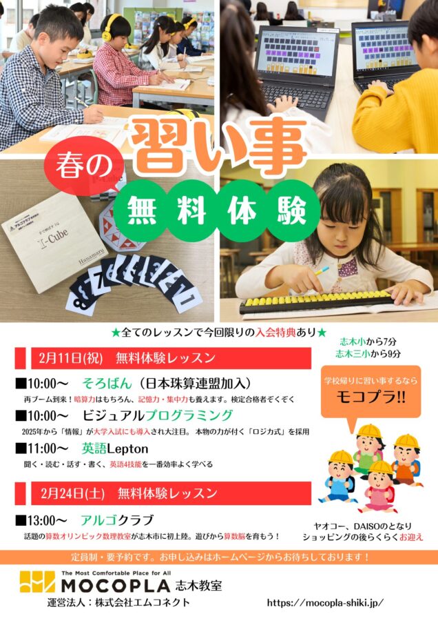 オープンMOCO&春の習い事無料体験を開催します|民間学童クラブMOCOPLA志木教室