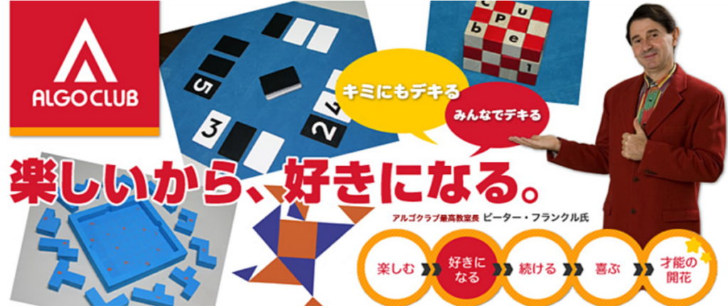 アルゴクラブは京都大学名誉教授である広中平祐先生が提唱し参画している算数オリンピック委員会、「算数脳」の第一人者である高濱正伸氏、東京大学数学科学生、そして数学者でありジャグラーとしても有名なピーター・フランクル氏がアルゴクラブ最高教室長として共同開発した小学校低学年向けの数理教育システムです。引用:アルゴクラブ